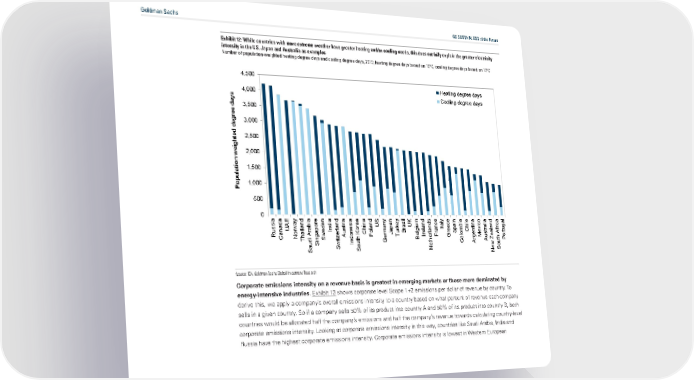 Goldman Sachs GS SUSTAIN: ESG of the Future Exhibit 12: While countries with more extreme weather have greater heating and/or cooling needs, this does not fully explain the greater electricity intensity in the US, Japan and Australia as examples Number of population-weighted heating degree days and cooling degree days, 2019; heating degree days based on 16°C, cooling degree days based on 18°C 4,500 Heating degree days s 4,000 Cooling degree days day3,500 ree 3,000 deg 2,500 eighted2,000 w on 1,500 Populati1,000 500 0 E y a a d y il d s y e e l ia da ndi re riaia n n m n d l ilna ndca b reain US a azUK u a i ico den a pan i n nceIt a ri UA rwa India o l g a pain l f uga ussana Araapoe ustnesK Ch Ja urkeyBrl relaar S Chent a A t R C Nohailai w A h Po T BeI F GreecolombiagMexustraliah or T ngS itzerland herl r A P i ndo Germ t C A ud S w I out e out a S S N S S New Ze Source: IEA, Goldman Sachs Global Investment Research Corporate emissions intensity on a revenue basis is greatest in emerging markets or those more dominated by energy-intensive industries. Exhibit 13 shows corporate level Scope 1+2 emissions per dollar of revenue by country. To derive this, we apply a companys overall emissions intensity to a country based on what percent of revenue each company sells in a given country. So if a company sells 50% of its product into country A and 50% of its product into country B, both countries would be allocated half the companys emissions and half the companys revenue towards calculating country-level corporate emissions intensity. Looking at corporate emissions intensity in this way, countries like Saudi Arabia, India and Russia have the highest corporate emissions intensity. Corporate emissions intensity is lowest in Western European