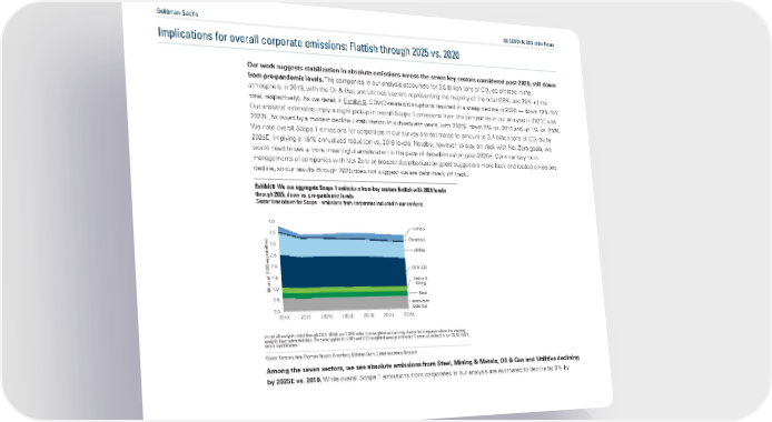 Goldman Sachs GS SUSTAIN: ESG of the Future Implications for overall corporate emissions: Flattish through 2025 vs. 2020 Our work suggests stabilization in absolute emissions across the seven key sectors considered post-2020, still down from pre-pandemic levels. The companies in our analysis accounted for 3.8 billion tons of CO -eq emitted in the 2 atmosphere in 2019, with the Oil & Gas and Utilities sectors representing the majority of the total (39% and 25% of the total, respectively). As we detail in Exhibit 6, COVID-related disruptions resulted in a steep decline in 2020 — down 10% YoY. Our analysts estimates imply a slight pickup in overall Scope 1 emissions from the companies in our analysis in 2021E and 2022E, followed by a modest decline / stabilization in subsequent years, with 2025E down 9% vs. 2019 and up 1% vs. 2020. We note overall Scope 1 emissions for corporates in our survey are estimated to amount to 3.4 billion tons of CO -eq by 2 2025E, implying a 1.6% annualized reduction vs. 2019 levels. Notably, however, to stay on track with Net Zero goals, we would need to see a more meaningful acceleration in the pace of decarbonization post-2025E. Commentary from managements of companies with Net Zero or broader decarbonization goals suggests a more back-end loaded emissions decline, so our results through 2025 does not suggest we are definitively off track. Exhibit 6: We see aggregate Scope 1 emissions from key sectors flattish with 2020 levels through 2025, down vs. pre-pandemic levels Sector breakdown for Scope 1 emissions from corporates included in our analysis. 4.0 Airlines 3.5 Chemicals tted3.0 Utilities eq emi2.5 -2.0 CO2 Oil & Gas 1.5 Metals & Gton of 1.0 Mining Steel 0.5 Construction 0.0 Materials 2019 2020 2021E 2022E 2023E 2024E 2025E As not all analysts model through 2025, 2024E and 2025E reflect the weighted average yoy change for companies where the covering analysts have submitted data. The same applies for 2019 and 2020 weighted average estimates. Sectors as de“ned in our GS SUSTAIN sector classi“cation. Source: Company data, Thomson Reuters, Bloomberg, Goldman Sachs Global Investment Research Among the seven sectors, we see absolute emissions from Steel, Mining & Metals, Oil & Gas and Utilities declining by 2025E vs. 2019. While overall Scope 1 emissions from corporates in our analysis are estimated to decline by 9% by
