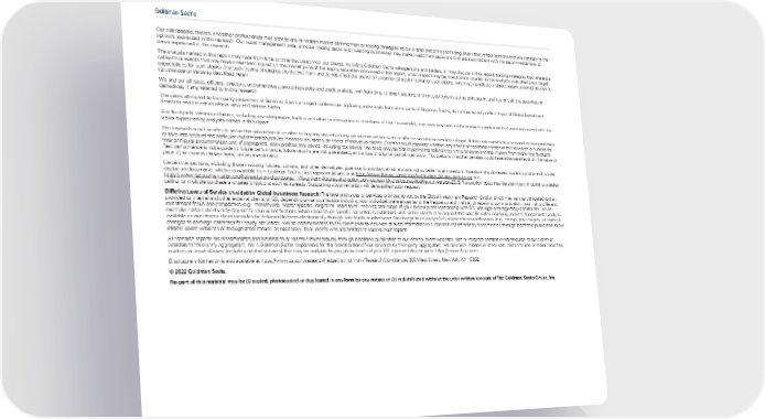 Goldman Sachs Our salespeople, traders, and other professionals may provide oral or written market commentary or trading strategies to our clients and principal trading desks that reflect opinions that are contrary to the opinions expressed in this research. Our asset management area, principal trading desks and investing businesses may make investment decisions that are inconsistent with the recommendations or views expressed in this research. y discuss in this report, trading strategies that reference The analysts named in this report may have from time to time discussed with our clients, including Goldman Sachs salespersons and traders, or ma y be directionally counter to the analysts published price target catalysts or events that may have a near-term impact on the market price of the equity securities discussed in this report, which impact ma h stocks, which rating reflects a stocks return potential relative to expectations for such stocks. Any such trading strategies are distinct from and do not affect the analysts fundamental equity rating for suc its coverage universe as described herein. y or sell, the securities or We and our affiliates, officers, directors, and employees, excluding equity and credit analysts, will from time to time have long or short positions in, act as principal in, and bu derivatives, if any, referred to in this research. hs, do not necessarily reflect those of Global Investment The views attributed to third party presenters at Goldman Sachs arranged conferences, including individuals from other parts of Goldman Sac Research and are not an official view of Goldman Sachs. v Any third party referenced herein, including any salespeople, traders and other professionals or members of their household, may ha e positions in the products mentioned that are inconsistent with the views expressed by analysts named in this report. This research is not an offer to sell or the solicitation of an offer to buy any security in any jurisdiction where such an offer or solicitation would be illegal. It does not constitute a personal recommendation h is suitable for or take into account the particular investment objectives, financial situations, or needs of individual clients. Clients should consider whether any advice or recommendation in this researc red to in this research and the income from them may fluctuate. their particular circumstances and, if appropriate, seek professional advice, including tax advice. The price and value of investments refer uations in exchange rates could have adverse effects on the value or Past performance is not a guide to future performance, future returns are not guaranteed, and a loss of original capital may occur. Fluct price of, or income derived from, certain investments. able f Certain transactions, including those involving futures, options, and other derivatives, give rise to substantial risk and are not suit or all investors. Investors should review current options and futures and disclosure documents which are available from Goldman Sachs sales representatives or at https://www.theocc.com/about/publications/character-risks.jsp 18. Transaction costs may be significant in option strategies https://www.fiadocumentation.org/fia/regulatory-disclosures_1/fia-uniform-futures-and-options-on-futures-risk-disclosures-booklet-pdf-version-20 calling for multiple purchase and sales of options such as spreads. Supporting documentation will be supplied upon request. Differing Levels of Service provided by Global Investment Research: The level and types of services provided to you by the Global Investment Research division of GS may vary as compared to that provided to internal and other external clients of GS, depending on various factors including your individual preferences as to the frequency and manner of receiving communication, your risk profile and investment focus and perspective (e.g., marketwide, sector specific, long term, short term), the size and scope of your overall client relationship with GS, and legal and regulatory constraints. As an example, certain clients may request to receive notifications when research on specific securities is published, and certain clients may request that specific data underlying analysts fundamental analysis available on our internal client websites be delivered to them electronically through data feeds or otherwise. No change to an analysts fundamental research views (e.g., ratings, price targets, or material changes to earnings estimates for equity securities), will be communicated to any client prior to inclusion of such information in a research report broadly disseminated through electronic publication to our internal client websites or through other means, as necessary, to all clients who are entitled to receive such reports. ebsites. Not all research content is redistributed to our clients or All research reports are disseminated and available to all clients simultaneously through electronic publication to our internal client w h, models or other data related to one or more securities, available to third-party aggregators, nor is Goldman Sachs responsible for the redistribution of our research by third party aggregators. For researc markets or asset classes (including related services) that may be available to you, please contact your GS representative or go to https://research.gs.com. Disclosure information is also available at https://www.gs.com/research/hedge.html or from Research Compliance, 200 West Street, New York, NY 10282. © 2022 Goldman Sachs. ior written consent of The Goldman Sachs Group, Inc. No part of this material may be (i) copied, photocopied or duplicated in any form by any means or (ii) redistributed without the pr