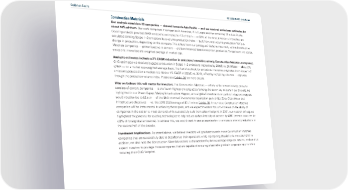Goldman Sachs GS SUSTAIN: ESG of the Future Construction Materials Our analysis considers 23 companies „ skewed towards Asia Pacific „ and we received emissions estimates for about 50% of them. Our work comprises 7 companies in Americas, 3 in Europe and the remaining 13 in Asia Pacific. Covering analysts provided GHG emissions estimates for 12 of them — or 52% of the total. Emissions intensities are calculated dividing Scope 1+2 emissions by a volume production index — built from total volume produced or YoY p.p. change in production, depending on the company. This differs from our colleagues Carbonomics work, where Construction Materials companies — primarily active in cement — are benchmarked based on cement production. To represent the sector, emissions intensities are weighted average of market cap. Analysts estimates indicate a 2% CAGR reduction in emissions intensities among Construction Materials companies. GHG estimates we received suggest a reduction in Scope 1+2 emissions intensities by 2025E vs. 2019 base — about 2% CAGR — on a market cap-weighted average basis. The flattish outlook for emissions intensities originates from Scope 1+2 emissions projected on a modest rise (below 1% CAGR in 2025E vs. 2019), offset by increasing volumes — captured through the production volume index. Please see Exhibit 36 for more details. Why we believe this will matter for investors. The Construction Materials — which, while not exclusively, primarily consists of cement companies — is the fourth highest emitting sector among the seven key sectors in our analysis. As highlighted in our Green Capex: Making Infrastructure Happen, annual global investments on path to Infrastructure goals would need to rise to $2.5 tn — of the $6.0 tn annual investments required on path to Net Zero, Clean Water and Infrastructure objectives — vs. the 2016-2020 average of $1.7 tn (see Exhibit 16 ). In our view, Construction Materials companies will be instrumental in achieving those goals, and we expect investors focus to increase on the ability of companies in the sector to meet demand while successfully curb their carbon footprint. In 2021, our research colleagues highlighted the potential for existing technologies to help reduce carbon intensity of cement by 40% (cement accounts for c.8% of total global emissions). To achieve this, we would need to see an acceleration in emissions intensity reductions in the second half of the decade. Investment Implications. As stated above, we believe investors will gravitate towards those Construction Materials companies that are successfully able to decarbonize their operations while maintaining the ability to meet demand. In addition, we also note the Construction Materials sectors is characterized by below-average corporate returns, and we thus expect investors to privilege those companies that are capable of ensuring a favorable profile in corporate returns while reducing their GHG footprint.
