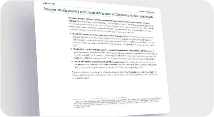 Goldman Sachs GS SUSTAIN: ESG of the Future Emissions intensity projected paths through 2025 by sector vs. Carbonomics Net Zero carbon models We believe investors will focus on both the absolute direction of emissions in a sector but also the emissions intensity. We believe companies with the greatest emissions intensity reductions may receive greater favor, particularly if their intensity reductions are consistent with a pathway to 1.5 degree or lower implied temperature rise. In 2021, our EMEA energy research team in its Carbonomics reports introduced three global sectoral paths to Net Zero carbon with global models of decarbonization by sector and technology leveraging its Carbonomics cost curve. n The GS 1.5° scenario is consistent with a 1.5°C global temperature rise. This scenario implies reaching global net zero carbon by 2050, thus with limited temperature overshoot. For this scenario, our Carbonomics team assumed a carbon budget for remaining net cumulative CO emissions from all sources from 2020 to be c.500 GtCO , in line with 2 2 1 the IPCC AR6 WGI Summary for Policymakers , and consistent with a 50% probability of limiting warming to 1.5°C by 2100. n The GS <2.0° „ or the “Paris AgreementŽ „ scenario is consistent with a rise well below 2.0°C. This scenario would be consistent with the aim outlined in Paris Agreement to keep global warming well below 2°C and achieve global net zero around 2060. For the purpose of this analysis, our Carbonomics team defined the cumulative remaining carbon budget for our GS <2.0° model to be 750 GtCO , consistent with around 1.65°C global warming with 50% probability. 2 n The GS 2.0° scenario is consistent with a 2.0°C temperature rises. This aims for global carbon neutrality by 2070 — and leads to a 50% probability of 2.0°C global warming to 2100. It has a cumulative carbon budget from 2020 of 1,350 1 GtCO , in line with the carbon budgets outlined in the IPCC AR6 WGI Summary for Policymakers . 2 Below, we detail percentage changes in emissions intensities by sector through 2025 based on our analysts Scope 1+2 forecasts, plotted against the percentage reductions by sector implied by our energy teams Carbonomics research for the three scenarios above. 1 IPCC, 2021: Summary for Policymakers. In: Climate Change 2021: The Physical Science Basis. Contribution of Working Group I to the Sixth Assessment Report of the Intergovernmental Panel on Climate Change [MassonDelmotte, V., P. Zhai, A. Pirani, S.L. Connors, C. Péan, S. Berger, N. Caud, Y. Chen, L. Goldfarb, M.I. Gomis, M. Huang, K. Leitzell, E. Lonnoy, J.B.R. Matthews, T.K. Maycock, T. Waterfield, O. Yelekçi, R. Yu, and B. Zhou (eds.)]. Cambridge University Press. In Press