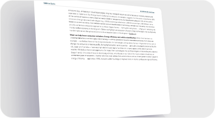 Goldman Sachs GS SUSTAIN: ESG of the Future emissions (e.g., emissions in industrial processes, long-haul transport) require solutions that are still relatively nascent and expensive to implement. Our Energy teams Carbonomics analysis, for example, suggests that the costs to decarbonize 50% of the worlds emissions currently stand at nearly US$80 or less per tonne, but decarbonizing beyond 75% of the worlds emissions through advanced technologies (e.g., CCUS) could require between US$150 to more than US$1,000 per tonne based on current solutions. Cost deflation across various decarbonization technology verticals and innovating new solutions are why we believe companies exposed to our Green Capex themes — both public and private — will play an increasing role in a low carbon economy in the long-term. Below we highlight an ecosystem of seven critical technologies that could provide transformational and disruptive solutions to drive decarbonization in the long-term (Exhibit 17). What can help lower consumer emissions: Energy efficiency and vehicle electrification. While there has been an understandable focus on the supply side of energy — shifting generation towards renewables and away from coal as an example — we believe there will be rising consideration for technologies and solutions that can mitigate demand as well or change the consumer emissions profile. As highlighted earlier, some countries — particularly developed economies like the US, Japan and Australia — have very high electricity per capita that does not uniquely appear attributable to extreme weather. We believe there is an opportunity for impact from technologies that can help mitigate emissions beyond corporate Scope 1 and 2. One area of focus is electrifying vehicles, which based on our ESG of the Future analysis should see an accelerated pace of adaptation. Another less discussed vertical that warrants focus and could see greater investor support is energy efficiency — appliances, HVAC, low/zero carbon buildings or improvements in internal combustion engine efficiency.
