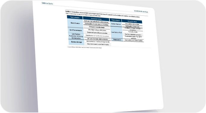 Goldman Sachs GS SUSTAIN: ESG of the Future Exhibit 17: Innovations across multiple technologies could help lower the cost of decarbonization and introduce new climate solutions Select focus areas for decarbonization technological innovation Technologies Innovation areas Technologies Innovation areas Next gen high cell efficiency technologies Carbon Capture New capture technologies Electrification Optimization of wafer size and thickness Optimization of input costs Changes in module design Localization of clean hydrogen ecosystems Grid Transmission Ultra-High Voltage (UHV) lines Low Carbon Fuel Fuel cell vehicles Equipment and software upgrades Gas-fired distributed generation Low Carbon Electrification of construction equipment Sustainable Aviation Fuel (SAF) Production & Energy solutions Conservation EAF and hydrogen steel production Digitalization Cost deflations in Silicon Carbide Battery Storage Improvements in battery energy density Graphene based super-fast charging Source: Goldman Sachs Global Investment Research, Gao Hua Securities Research