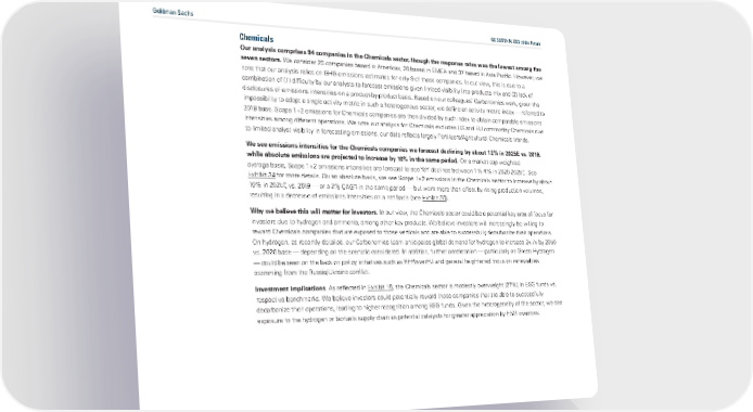 Goldman Sachs GS SUSTAIN: ESG of the Future Chemicals Our analysis comprises 94 companies in the Chemicals sector, though the response rates was the lowest among the seven sectors. We consider 29 companies based in Americas, 28 based in EMEA and 37 based in Asia Pacific. However, we note that our analysis relies on GHG emissions estimates for only 9 of those companies. In our view, this is due to a combination of (1) difficulty by our analysts to forecast emissions given limited visibility into products mix and (2) lack of disclosures of emissions intensities on a product-by-product basis. Based on our colleagues Carbonomics work, given the impossibility to adopt a single activity metric in such a heterogenous sector, we define an activity metric index — referred to 2019 base. Scope 1+2 emissions for Chemicals companies are then divided by such index to obtain comparable emissions intensities among different operations. We note our analysis for Chemicals excludes US and EU commodity Chemicals due to limited analyst visibility in forecasting emissions: our data reflects largely Fertilizers/Agricultural Chemicals trends. We see emissions intensities for the Chemicals companies we forecast declining by about 12% in 2025E vs. 2019, while absolute emissions are projected to increase by 10% in the same period. On a market cap weighted average-basis, Scope 1+2 emissions intensities are forecast to see YoY declines between 1%-4% in 2020-2025E. See Exhibit 34 for more details. On an absolute basis, we see Scope 1+2 emissions in the Chemicals sector to increase by about 10% in 2025E vs. 2019 — or a 2% CAGR in the same period — but were more than offset by rising production volumes, resulting in a decrease of emissions intensities on a net basis (see Exhibit 35). Why we believe this will matter for investors. In our view, the Chemicals sector could be a potential key area of focus for investors due to hydrogen and ammonia, among other key products. We believe investors will increasingly be willing to reward Chemicals companies that are exposed to those verticals and are able to successfully decarbonize their operations. On hydrogen, as recently detailed, our Carbonomics team anticipates global demand for hydrogen to increase 2x-7x by 2050 vs. 2020 base — depending on the scenario considered. In addition, further acceleration — particularly on Green Hydrogen — could be seen on the back on policy initiatives such as REPowerEU and general heightened focus on renewables stemming from the Russia/Ukraine conflict. Investment Implications. As reflected in Exhibit 18 , the Chemicals sector is modestly overweight (27%) in ESG funds vs. respective benchmarks. We believe investors could potentially reward those companies that are able to successfully decarbonize their operations, leading to higher recognition among ESG funds. Given the heterogeneity of the sector, we see exposure to the hydrogen or biofuels supply chain as potential catalysts for greater appreciation by ESG investors.