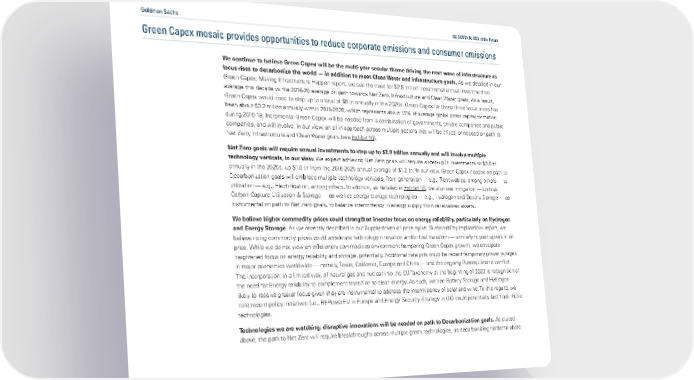 Goldman Sachs GS SUSTAIN: ESG of the Future Green Capex mosaic provides opportunities to reduce corporate emissions and consumer emissions We continue to believe Green Capex will be the multi-year secular theme driving the next wave of infrastructure as focus rises to decarbonize the world „ in addition to meet Clean Water and Infrastructure goals. As we detailed in our Green Capex: Making Infrastructure Happen report, we see the need for $2.8 trillion incremental annual investment on average this decade vs the 2016-20 average on path towards Net Zero, Infrastructure and Clean Water goals. As a result, Green Capex would need to step up to a total of $6 tn annually in the 2020s. Green Capex for those three focus areas has been about $3.2 trillion annually within 2016-2020, which represents about 15% of average global gross capital formation during 2016-19. Incremental Green Capex will be needed from a combination of governments, private companies and public companies, and will involve, in our view, an all-in approach across multiple sectors that will be critical or needed on path to Net Zero, Infrastructure and Clean Water goals (see Exhibit 16). Net Zero goals will require annual investments to step up to $3.0 trillion annually and will involve multiple technology verticals, in our view. We expect achieving Net Zero goals will require a step-up in investments to $3.0 tn annually in the 2020s, up $1.8 tn from the 2016-2020 annual average of $1.2 tn. In our view, Green Capex needed on path to Decarbonization goals will embrace multiple technology verticals, from generation — e.g., Renewables, among others — to utilization — e.g., Electrification, among others. In addition, as detailed in Exhibit 16 , we also see mitigation — such as Carbon Capture Utilization & Storage — as well as energy storage technologies — e.g., Hydrogen and Battery Storage — as instrumental on path to Net Zero goals, to balance intermittency in energy supply from renewables assets. We believe higher commodity prices could strengthen investor focus on energy reliability, particularly on Hydrogen and Energy Storage. As we recently described in our Supply-driven oil price spike: Sustainability implications report, we believe rising commodity prices could accelerate technology innovation and/or fuel transition — similarly to past spikes in oil price. While we do not view an inflationary commodities environment hampering Green Capex growth, we anticipate heightened focus on energy reliability and storage, potentially. Additional catalysts could be recent temporary power outages in major economies worldwide — namely, Texas, California, Europe and China — and the ongoing Russia/Ukraine conflict. The incorporation, in a limited way, of natural gas and nuclear into the EU Taxonomy at the beginning of 2022 is recognition of the need for Energy reliability to complement transition to clean energy. As such, we see Battery Storage and Hydrogen likely to receive greater focus given they are instrumental to address the intermittency of solar and wind. To this regard, we note recent policy initiatives (i.e., REPowerEU in Europe and Energy Security Strategy in UK) could potentially fast-track those technologies. Technologies we are watching: disruptive innovations will be needed on path to Decarbonization goals. As stated above, the path to Net Zero will require breakthroughs across multiple green technologies, as decarbonizing harder-to-abate