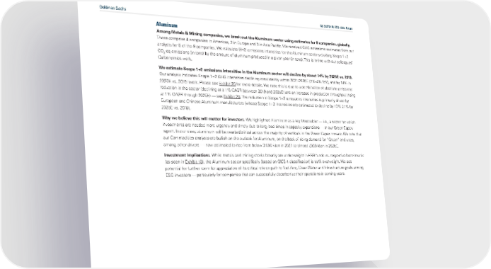 Goldman Sachs GS SUSTAIN: ESG of the Future Aluminum Among Metals & Mining companies, we break out the Aluminum sector using estimates for 9 companies, globally. Those comprise 4 companies in Americas, 2 in Europe and 3 in Asia Pacific. We received GHG emissions estimates from our analysts for 5 of the 9 companies. We calculate GHG emissions intensities for the Aluminum sectors dividing Scope 1+2 CO-eq emissions (in tons) by the amount of aluminum produced in a given year (in tons). This is in-line with our colleagues 2 Carbonomics work. We estimate Scope 1+2 emissions intensities in the Aluminum sector will decline by about 14% by 2025E vs. 2019. Our analysis indicates Scope 1+2 GHG intensities declining consistently within 2021-2025E (2%-4% YoY), and by 14% in 2025E vs. 2019 levels. Please see Exhibit 25 for more details. We note this is due to a combination of absolute emissions reduction in the sector (declining at a 1% CAGR between 2019 and 2025E) and an increase in production throughput (rising at 1% CAGR through 2025E) — see Exhibit 26. The reduction in Scope 1+2 emissions intensities is primarily driven by European and Chinese Aluminum manufacturers (whose Scope 1+2 intensities are estimated to decline by 13%-21% by 2025E vs. 2019). Why we believe this will matter for investors. We highlighted Aluminum as a key Greenabler — i.e., a sector for which investments are needed more urgently and timely due to long lead-times in capacity expansions — in our Green Capex report. In our view, aluminum will be needed/critical across the majority of verticals in the Green Capex mosaic. We note that our Commodities analysts are bullish on the outlook for Aluminum, on the back of rising demand for “Green” end-uses, among other drivers — now estimated to rise from below 3,000 kton in 2021 to almost 7,000 kton in 2025E. Investment Implications. While metals and mining stocks broadly are underweight in ESG funds vs. respective benchmarks (as seen in Exhibit 18), the Aluminum sector specifically (based on GICS 4 classification) is 55% overweight. We see potential for further room for appreciation of its critical role on path to Net Zero, Clean Water and Infrastructure goals among ESG investors — particularly for companies that can successfully decarbonize their operations in coming years.