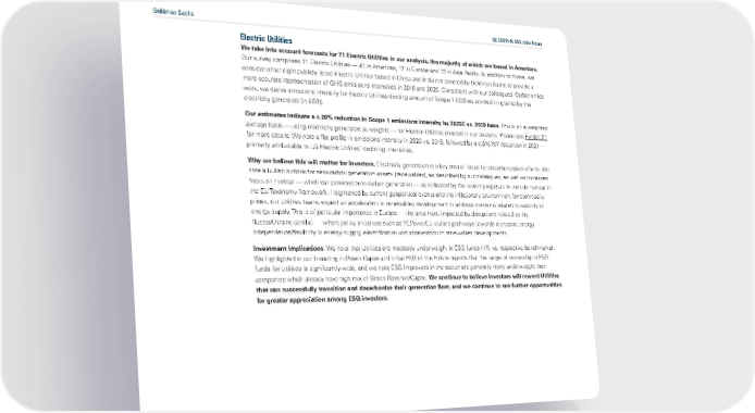 Goldman Sachs GS SUSTAIN: ESG of the Future Electric Utilities We take into account forecasts for 71 Electric Utilities in our analysis, the majority of which are based in Americas. Our survey comprises 71 Electric Utilities — 41 in Americas, 17 in Europe and 13 in Asia Pacific. In addition to those, we consider other eight publicly listed Electric Utilities based in China and India not covered by Goldman Sachs to provide a more accurate representation of GHG emisisons intensities in 2019 and 2020. Consistent with our colleagues Carbonomics work, we derive emissions intensity for Electric Utilities dividing amount of Scope 1 CO2-eq emitted (in grams) by the electricity generated (in kWh). Our estimates indicate a c.20% reduction in Scope 1 emissions intensity by 2025E vs. 2019 base. This is on a weighted average basis — using electricity generated as weights — for Electric Utilities covered in our analysis. Please see Exhibit 21 for more details. We note a flat profile in emissions intensity in 2020 vs. 2019, followed by a c.6% YoY reduction in 2021 — primarily attributable to US Electric Utilities declining intensities. Why we believe this will matter for investors. Electricity generation is a key area of focus for decarbonization efforts. We note a bullish outlook for zero-carbon generation assets (renewables), as described by our colleagues, as well as increased focus on nuclear — which can provided zero-carbon generation — as indicated by the recent proposals to include nuclear in the EU Taxonomy framework. Heightened by current geopolitical events and the inflationary environment for commodity prices, our Utilities teams expect an acceleration in renewables development to address concerns related to security of energy supply. This is of particular importance in Europe — the area most impacted by disruptions related to the Russia/Ukraine conflict — where policy initiatives such as REPowerEU outline pathways towards increased energy independence/flexibility in energy supply, electrification and acceleration in renewables developments. Investment Implications. We note that Utilities are modestly underweight in ESG funds (1% vs. respective benchmarks). We highlighted in our Investing in Green Capex and initial ESG of the Future reports that the range of ownership in ESG funds for Utilities is significantly wide, and we note ESG Improvers in the sector are generally more underweight than companies which already have high mix of Green R evenue/Capex. We continue to believe investors will reward Utilities that can successfully transition and decarbonize their generation fleet, and we continue to see further opportunities for greater appreciation among ESG investors.
