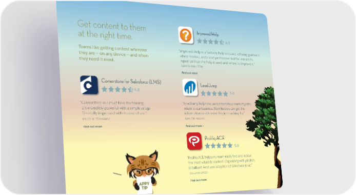 Get content to them Improved Help at the right time. 4.9 Teams like getting content wherever “ Improved Help is a fantastic help resource, offering guidance they are — on any device — and when when needed, and a comprehensive tool for admins to they need it most. report on how the help is used and where to improve it.” DARREN BURLESON Find out more Cornerstone for Salesforce (LMS) LevelJump 4.8 5.0 “ Cornerstone is a must-have for training. “ LevelJump helps me understand how content paths It’s incredibly powerful with a simple setup. relate to our business. Now leaders can get the I’m really impressed with its ease of use.” information enablement they’re searching for.” MELODIE SCHWARTZ KARL ORTMANNS Find out more Find out more > Prolifiq ACE 5.0 “ Prolifiq ACE helps my team easily find and action the most valuable content. Organizing with playlists is brilliant. And user adoption of Salesforce is up.” WILLIAM GREEN APPY Find out more TIP