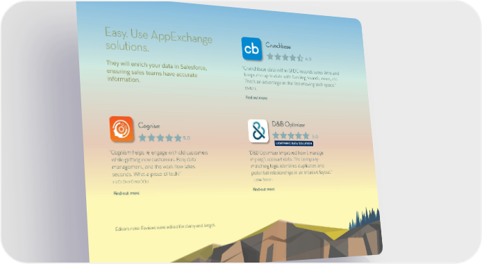 Easy. Use AppExchange Crunchbase solutions. 4.9 They will enrich your data in Salesforce, “ Crunchbase data within SFDC records saves time and ensuring sales teams have accurate keeps me up to date with funding rounds, news, etc. information. That’s an advantage in the fast-moving tech space.” EMILY L. Find out more Cognism D&B Optimizer 5.0 5.0 lightning data solution “ Cognism helps re-engage with old customers “ D&B Optimizer improved how I manage while getting new customers. Easy data my org’s account data. The company- management, and the work flow takes matching logic identifies duplicates and seconds. What a piece of tech!” potential relationships in an intuitive layout.” HECTOR FORWOOD DINA SMITH Find out more Find out more Editor’s note: Reviews were edited for clarity and length.