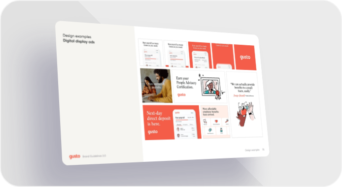 Design examples Digital display ads 75 Design examples Brand Guidelines 3.0 Gusto Brand Book Page 74 Page 76