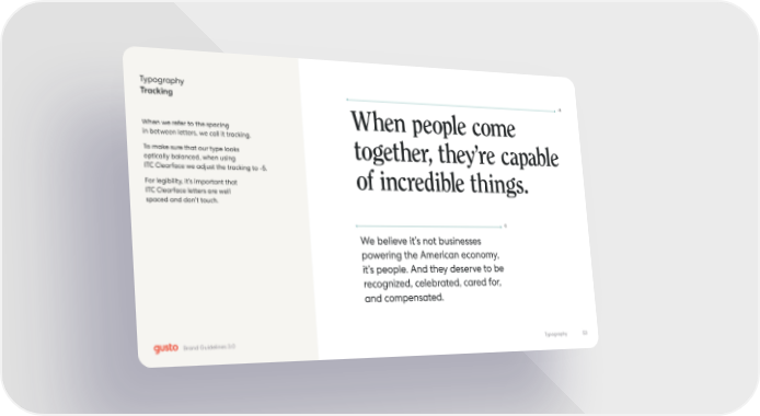 Typography Tracking When we refer to the spacing in between letters, we call it tracking. To make sure that our type looks optically balanced, when using ITC Clearface we adjust the tracking to -5. For legibility, it’s important that ITC Clearface letters are well spaced and don’t touch. -5 0 When people come together, they’re capable of incredible things. We believe it’s not businesses powering the American economy, it’s people. And they deserve to be recognized, celebrated, cared for, and compensated. 53 Typography Brand Guidelines 3.0