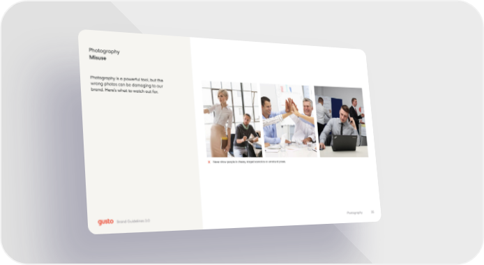 Photography Misuse Photography is a powerful tool, but the wrong photos can be damaging to our brand. Here’s what to watch out for. Never show people in cheesy, staged scenarios or unnatural poses. 35 Photography Brand Guidelines 3.0