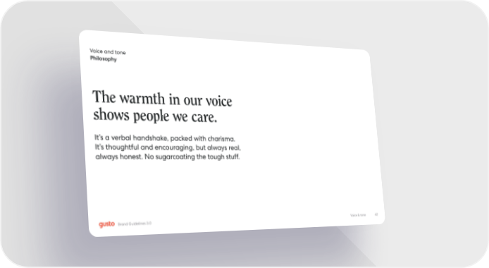 Voice and tone Philosophy The warmth in our voice shows people we care. It’s a verbal handshake, packed with charisma. It’s thoughtful and encouraging, but always real, always honest. No sugarcoating the tough stuff. 62 Voice & tone Brand Guidelines 3.0
