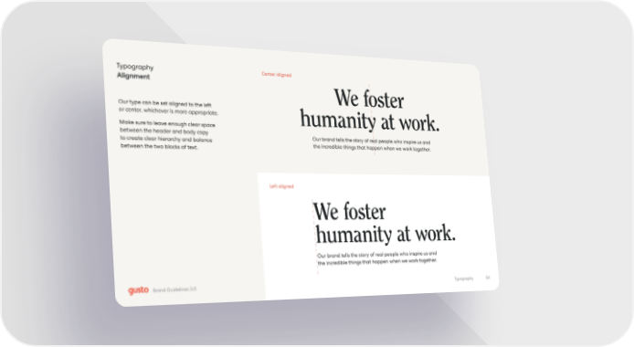 We foster humanity at work. Typography Alignment Our type can be set aligned to the left or center, whichever is more appropriate. Make sure to leave enough clear space between the header and body copy to create clear hierarchy and balance between the two blocks of text. Our brand tells the story of real people who inspire us and the incredible things that happen when we work together. Center aligned Left aligned Our brand tells the story of real people who inspire us and the incredible things that happen when we work together. We foster humanity at work. 54 Typography Brand Guidelines 3.0