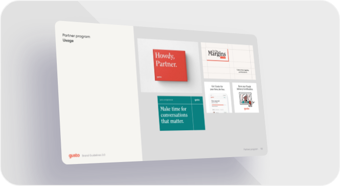Gusto Brand Book Page 91 Page 93Partner program Usage Make time for conversations that matter. gusto.com/getstarted Get Gusto for your firm, for free. 92 Partner program Brand Guidelines 3.0