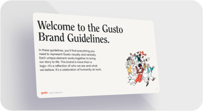 In these guidelines, you’ll find everything you need to represent Gusto visually and verbally. Each unique element works together to bring our story to life. This brand is more than a logo—it’s a reflection of who we are and what we believe. It’s a celebration of humanity at work. Welcome to the Gusto Brand Guidelines. 3 Brand Guidelines 3.0