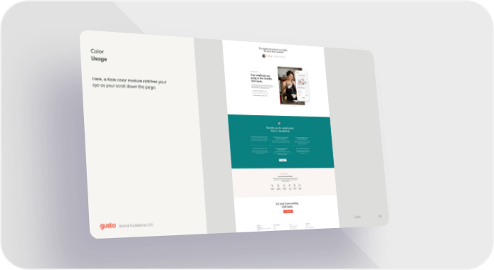 Gusto Brand Book Page 25 Page 27Color Usage Here, a Kale color module catches your eye as your scroll down the page. 26 Color Brand Guidelines 3.0