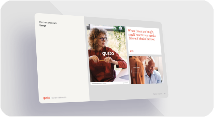 Partner program Usage Liam Jones Northwest Accounting PEOPLE ADVISOR CERTIFIED ‘21 Gusto Pro offers powerful tools for accountants. gusto.com/partners When times are tough, small businesses need a different kind of advisor. 89 Partner program Brand Guidelines 3.0