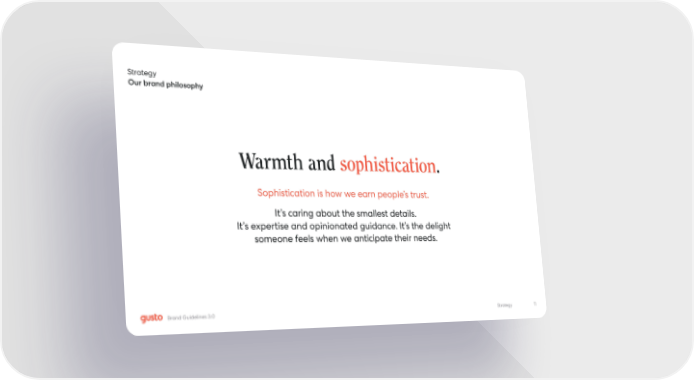 Warmth and sophistication . Sophistication is how we earn people’s trust. It’s caring about the smallest details. It’s expertise and opinionated guidance. It’s the delight someone feels when we anticipate their needs. Strategy Our brand philosophy 11 Strategy Brand Guidelines 3.0