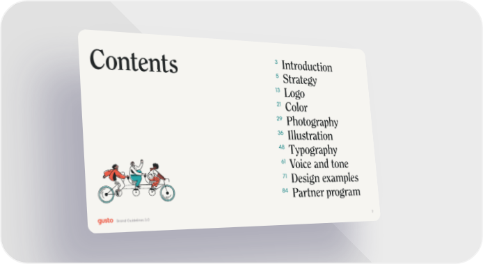 Gusto Brand Book Page 1 Page 33 Introduction 5 Strategy 13 Logo 21 Color 29 Photography 36 Illustration 48 Typography 61 Voice and tone 71 Design examples 84 Partner program Contents 2 Brand Guidelines 3.0