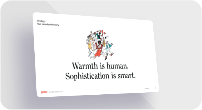 Gusto Brand Book Page 11 Page 13Strategy Our brand philosophy Warmth is human. Sophistication is smart. 12 Strategy Brand Guidelines 3.0