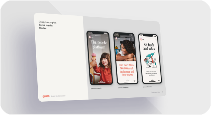 The people platform Gusto 09:19 Join more th an 100,000 small businesses and their te ams Gusto 09:19 Gusto 09:19 Sit back and relax With just a few clicks, we calculate and file your payroll taxes Design examples Social media Stories Type on photography Type and photography Type and illustration 78 Design examples Brand Guidelines 3.0