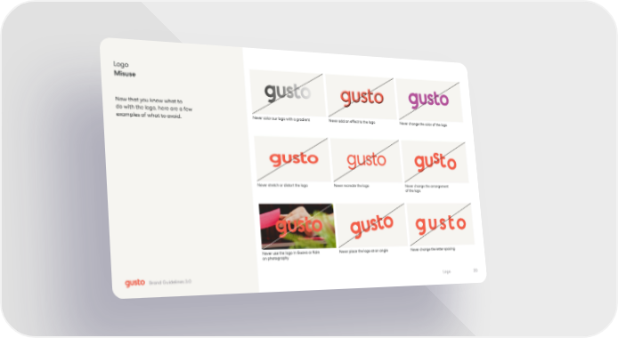 Logo Misuse Now that you know what to do with the logo, here are a few examples of what to avoid. Never color our logo with a gradient Never add an effect to the logo Never recreate the logo Never place the logo at an angle Never stretch or distort the logo Never use the logo in Guava or Kale on photography Never change the color of the logo Never change the arrangement of the logo gusto Never change the letter spacing 20 Logo Brand Guidelines 3.0
