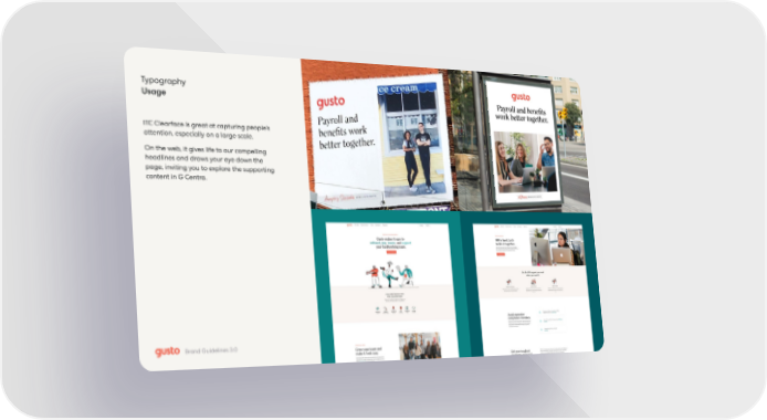 Typography Usage ITC Clearface is great at capturing people’s attention, especially on a large scale. On the web, it gives life to our compelling headlines and draws your eye down the page, inviting you to explore the supporting content in G Centra. 58 Brand Guidelines 3.0