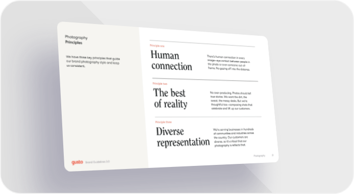 Photography Principles There’s human connection in every image—eye contact between people in the photo or even someone out-of- frame. No gazing off into the distance. No over-producing. Photos should tell true stories. We want the dirt, the sweat, the messy desks. But we’re thoughtful too—composing shots that celebrate and lift up our customers. We’re serving businesses in hundreds of communities and industries across the country. Our customers are diverse, so it’s critical that our photography is reflects that. We have three key principles that guide our brand photography style and keep us consistent. Human connection The best of reality Diverse representation Principle one Principle two Principle three 31 Photography Brand Guidelines 3.0