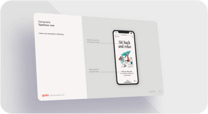 Typography Typefaces: core Here is an example or heirachy. Gusto 09:19 Sit back and relax With just a few clicks, we calculate and file your payroll taxes Headline typeface ITC Clearface Bold Body typeface G Centra Book 50 Typography Brand Guidelines 3.0