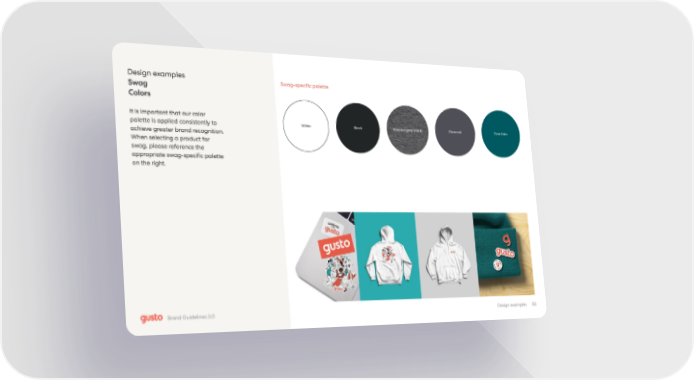Design examples Swag Colors It is important that our color palette is applied consistently to achieve greater brand recognition. When selecting a product for swag, please reference the appropriate swag-specific palette on the right. Black White Heather gray (dark) Charcoal Dark Kale Swag-specific palette 83 Design examples Brand Guidelines 3.0