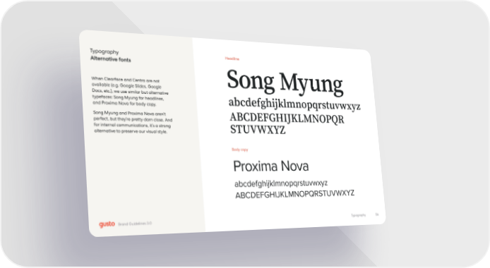 Typography Alternative fonts When Clearface and Centra are not available (e.g. Google Slides, Google Docs, etc.), we use similar but alternative typefaces: Song Myung for headlines, and Proxima Nova for body copy. Song Myung and Proxima Nova aren’t perfect, but they’re pretty darn close. And for internal communications, it’s a strong alternative to preserve our visual style. Song Myung abcdefghijklmnopqrstuvwxyz ABCDEFGHIJKLMNOPQR STUVWXYZ abcdefghijklmnopqrstuvwxyz ABCDEFGHIJKLMNOPQRSTUVWXYZ Proxima Nova Headline Body copy 56 Typography Brand Guidelines 3.0