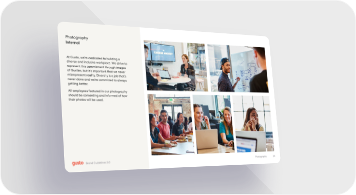 Photography Internal At Gusto, we’re dedicated to building a diverse and inclusive workplace. We strive to represent this commitment through images of Gusties, but it’s important that we never misrepresent reality. Diversity is a job that’s never done and we’re committed to always getting better. All employees featured in our photography should be consenting and informed of how their photos will be used. 34 Photography Brand Guidelines 3.0