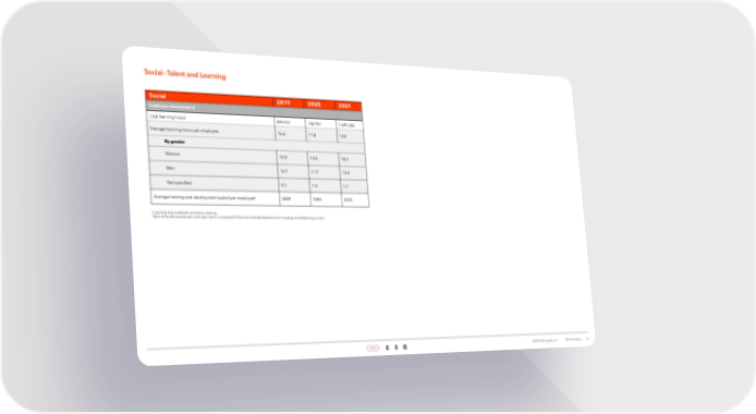 Social—Talent and Learning Social 2019 2020 2021 Employee development 1 Total learning hours 899,937 722,967 1,049,385 Average learning hours per employee 15.6 11.8 14.0 By gender Women 13.8 12.0 15.3 Men 16.7 11.7 13.4 Not specified 0.3 1.5 1.7 Average training and development spend per employee2 $449 $386 $325 1 Learning hours exclude contractor training. 2 Spend has decreased year over year due to increased efficiencies and decreased cost of creating and delivering content. HOME E S G ©2022 GXO Logisitcs, Inc. 2021 ESG Report | 91