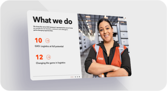 What we do Return to contents We chose the name GXO because it represents the core of what we provide for our investors, customers and colleagues: game-changing opportunities. 10 GXO: Logistics at full potential 12 Changing the game in logistics ©2022 GXO Logisitcs, Inc. 2200221 E1 ESG RSG Reeppoorrt t | | 99 HOME E S G HOME E S G ©2022 GXO Logisitcs, Inc.