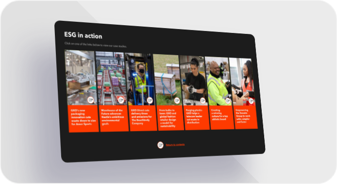 ESG in action Click on one of the links below to view our case studies. GXO’s new Warehouse of the GXO Direct cuts From bulbs to Purging plastic: Creating Empowering packaging Future advances delivery times bees: GXO and GXO helps a a winning the Dunelm innovation cuts Nestlé’s ambitious and emissions for global fashion telecom leader culture for a top Group to work waste down to size environmental The Beachbody retailer design cut waste in athletic brand safer, simpler for Amer Sports goals Company a model for distribution and faster sustainability Return to contents 94 | 2021 ESG Report ©2022 GXO Logisitcs, Inc. HOME E S G