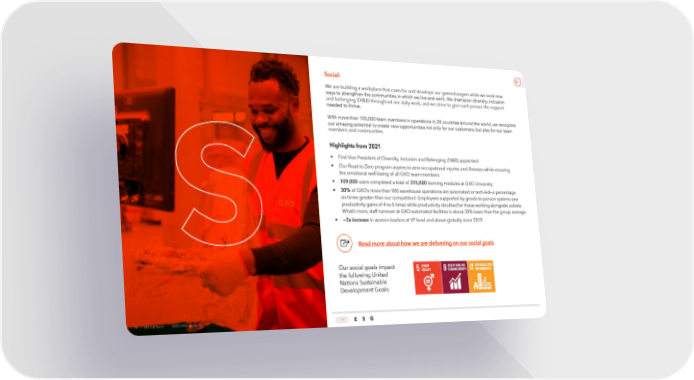 Social: We are building a workplace that cares for and develops our gamechangers while we seek new ways to strengthen the communities in which we live and work. We champion diversity, inclusion and belonging (DI&B) throughout our daily work, and we strive to give each person the support needed to thrive. With more than 100,000 team members in operations in 28 countries around the world, we recognize our amazing potential to create new opportunities not only for our customers, but also for our team members and communities. Highlights from 2021 • First Vice President of Diversity, Inclusion and Belonging (DI&B) appointed • Our Road to Zero program aspires to zero occupational injuries and illnesses while ensuring the emotional well-being of all GXO team members • 109,000 users completed a total of 315,000 learning modules at GXO University • 30% of GXO’s more than 900 warehouse operations are automated or tech-led—a percentage six times greater than our competitors’. Employees supported by goods-to-person systems saw productivity gains of 4 to 6 times while productivity doubled for those working alongside cobots. What’s more, staff turnover at GXO automated facilities is about 30% lower than the group average. • ~2x increase in women leaders at VP level and above globally since 2019 Read more about how we are delivering on our social goals Our social goals impact the following United Nations Sustainable Development Goals: 24 | 2021 ESG Report ©2022 GXO Logisitcs, Inc. 24 | 2021 ESG Report ©2022 GXO Logisitcs, Inc. HOME E S G