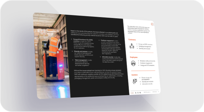 The materiality matrix reflects the issues our stakeholders deem important for GXO to address. Individual stakeholder groups also expressed issues of the most importance Based on the results of this analysis, the issues reflected in our global goals and to them: additional issues prioritized by our customers, investors and employees, we have identified the following priority material issues for GXO over the next 3-5 years: Customers: • Energy & Greenhouse Gas (GHG) • Employee engagement includes emissions includes our carbon our work environment and culture, • Energy and GHG emissions footprint, use of renewable energy, employee satisfaction and well-being • Packaging management energy efficiency and reduced and compensation and benefits emissions from optimizing logistics as well as proactive and productive • Diversity and inclusion for our customers. communication with team members, respect for workers’ rights and • Diversity and inclusion includes compliance with applicable our culture of belonging and labor regulations. board, executive, workforce and supplier diversity. • Information security includes data Employees: privacy and protection and the security • Talent management includes of our information systems along with • Workplace safety and security recruitment, retention, the data they contain. • Employee engagement development & learning and career progression. • Energy and GHG emissions While all the issues analyzed are important to GXO, the above issues represent areas where stakeholders have indicated that we can have the greatest impact. GXO will continue to carefully consider all ESG-related issues and intends to focus Investors: appropriately on the additional issues prioritized by our stakeholders, including packaging management, waste and workplace safety and security. • Climate change risk and adaptation • Diversity and inclusion • Information security HOME E S G HOME E S G ©2022 GXO Logisitcs, Inc. 2021 ESG Report | 21