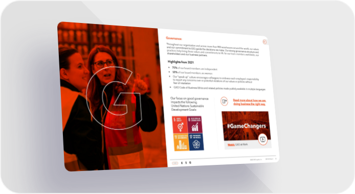 Governance: Throughout our organization and across more than 900 warehouses around the world, our values and our commitment to ESG guide the decisions we make. Our strong governance structure and practices help bring these values and commitments to life for our team members worldwide, our shareholders and our business partners. Highlights from 2021 • 75% of our board members are independent • 50% of our board members are women • Our “speak up” culture encourages colleagues to embrace each employee’s responsibility to report any concerns over or potential violations of our values or policies without fear of retaliation • GXO Code of Business Ethics and related policies made publicly available in multiple languages Our focus on good governance Read more about how we are impacts the following doing business the right way United Nations Sustainable Development Goals: Watch: GXO at Work HOME E S G ©2022 GXO Logisitcs, Inc. 2021 ESG Report | 25