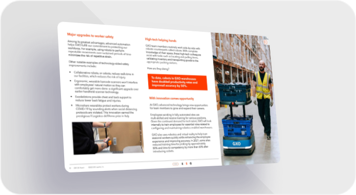 Major upgrades to worker safety High-tech helping hands Among its greatest advantages, advanced automation GXO team members routinely work side-by-side with helps GXO fulfill our commitment to protecting our robotic counterparts called cobots. With complete workforce. For example, using robots to perform knowledge of their space, these high-tech colleagues repeatable movements over sustained periods of time assist with tasks such as locating and pulling items, minimizes the risk of repetitive strain. validating inventory and transporting goods to the Other notable examples of technology-aided safety appropriate packing stations. improvements include: How are they doing? • Collaborative robots, or cobots, reduce walk-time in To date, cobots in GXO warehouses our facilities, which reduces the risk of injury. have doubled productivity rates and • Ergonomic, wearable barcode scanners won’t interfere improved accuracy by 50%. with employees’ natural motion so they can comfortably get more done—a significant upgrade over earlier handheld scanner technology. • Exoskeletons provide chest and back support to With innovation comes opportunity reduce lower back fatigue and injuries. • Microshare wearables protect workers during At GXO, advanced technology brings new opportunities COVID-19 by sounding alerts when social distancing for team members to grow and expand their careers. protocols are violated. This innovation earned the Employees working in fully automated sites are prestigious Il Logistico dell’Anno prize in Italy. multi-skilled and receive training for various positions. Given the continued demand for tech talent, GXO will look internally to train employees for essential roles related to configuring and maintaining robotics-enabled warehouses. GXO also uses robotics and virtual reality to help train seasonal workers quickly while enhancing the employee experience and improving accuracy. In 2021, some sites reduced training time for picking by approximately 80% and time to competency by more than 60% after introducing cobots. 58 | 2021 ESG Report ©2022 GXO Logisitcs, Inc. HOME E S G