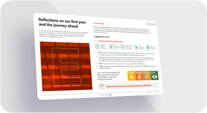 Return to contents Return to summary Reflections on our first year Environmental: and the journey ahead We focus on sustainability for two reasons. First, it’s the right thing to do for our planet. And second, it’s important to our customers, employees and investors. We’re actively partnering with customers around the world to help them achieve their sustainability goals while we innovate to reduce our own In our first year as an independent company, we are proud of the progress environmental impact. we have made against our ESG priorities and look forward to further Highlights from 2021 progress on our ESG journey. Here are a few highlights from 2021. Read more throughout the report. • 5 ambitious environmental goals launched 80% global 80% 30% GHG emissions 50% 100% operations global landfill (Scopes 1 & 2) renewable carbon neutral using LED diversion rate reduction by 2030 energy globally (Scopes 1 & 2) lighting by 2025 by 2025 vs. 2019 baseline by 2030 by 2040 • 37% of GXO-owned or leased facilities globally are ISO 14001—certified, and our new logistics center in Trecate, Italy, aims to be the first LEED v4 Platinum-certified warehouse in the EU • Our global Scope 1 and 2 emissions have decreased by 13,624 metric tons CO e since 2019 and 2 our emissions intensity has decreased 16.7 metric tons CO e per million dollars of revenue, or 26%, 2 since 2019, even as we have expanded our business and footprint significantly • 47% of our floorspace in the U.S. and Europe using energy-efficient LED lighting • 79% of waste diverted from landfill globally in 2021, nearing our 2025 target of 80% landfill diversion ahead of schedule Our environmental sustainability efforts align with the following United Nations Sustainable Development Goals: Read more about how we are changing the game in sustainability HOME E S G ©2022 GXO Logisitcs, Inc. 2021 ESG Report | 23