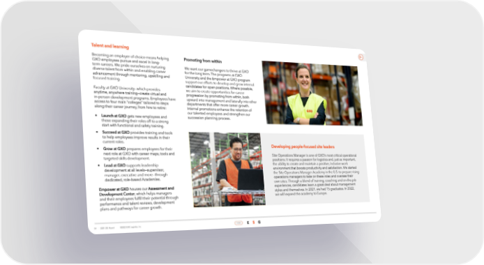 Talent and learning Becoming an employer of choice means helping Promoting from within GXO employees pursue and excel in long- We want our gamechangers to thrive at GXO term careers. We pride ourselves on nurturing for the long term. The programs at GXO diverse talent from within and enabling career University and the Empower at GXO program advancement through mentoring, upskilling and support our efforts to develop and grow internal focused training. candidates for open positions. Where possible, Faculty at GXO University—which provides we aim to create opportunities for career anytime, anywhere training—create virtual and progression by promoting from within, both in-person development programs. Employees have upward into management and laterally into other access to four main “colleges” tailored to steps departments that offer more career growth. along their career journey, from hire to retire: Internal promotions enhance the retention of our talented employees and strengthen our • Launch at GXO gets new employees and succession planning process. those expanding their roles off to a strong start with functional and safety training. • Succeed at GXO provides training and tools to help employees improve results in their current roles. Developing people-focused site leaders • Grow at GXO prepares employees for their next role at GXO with career maps, tools and Site Operations Manager is one of GXO’s most critical operational targeted skills development. positions. It requires a passion for logistics and, just as important, • Lead at GXO supports leadership the ability to create and maintain a positive, inclusive work development at all levels—supervisor, environment that boosts productivity and satisfaction. We started manager, executive and more—through the Site Operations Manager Academy in the U.S. to prepare rising dedicated, role-based Academies. operations managers to take on these roles and oversee their own sites. Through a blend of training, coaching and on-the-job Empower at GXO houses our Assessment and experiences, candidates learn a great deal about management Development Center, which helps managers styles and themselves. In 2021, we had 15 graduates. In 2022, and their employees fulfill their potential through we will expand the academy to Europe. performance and talent reviews, development plans and pathways for career growth. 54 | 2021 ESG Report ©2022 GXO Logisitcs, Inc. HOME E S G