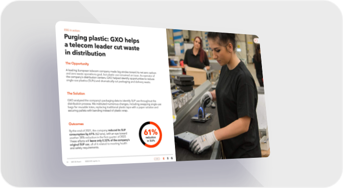 ESG in action: Purging plastic: GXO helps a telecom leader cut waste in distribution The Opportunity A leading European telecom company made big strides toward its net zero carbon and zero waste operations goal, but plastic use remained an issue. As operator of the company’s distribution centers, GXO helped identify opportunities to reduce single-use plastics (SUPs) and dramatically cut packaging and delivery waste. The Solution GXO analyzed the company’s packaging data to identify SUP use throughout the distribution process. We instituted numerous changes, including swapping single-use bags for reusable totes, replacing traditional plastic tape with a paper solution and securing pallets with banding instead of plastic wrap. Outcomes By the end of 2021, the company reduced its SUP consumption by 61% (62 tons), with an eye toward 61% another 38% reduction in the first quarter of 2022. reduction These efforts will leave only 0.32% of the company’s in SUPs original SUP use, all of it related to meeting health and safety requirements. 34 | 2021 ESG Report ©2022 GXO Logisitcs, Inc. HOME HOME E S G E S G