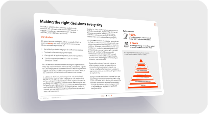 Making the right decisions every day Our culture at GXO is about achieving results through Globally, the Ethics and Compliance team promotes By the numbers teamwork. We help each other succeed. We’re proud to the Code internally and, in partnership with Human support our customers, partners and team members. Resources, ensures that all employees receive, 100% We’re fair, respectful, lawful and honest. understand and agree in writing to abide by the of employees receive and are required Shared values Code and take part in relevant training programs. to sign GXO’s Code of Business Ethics All GXO team members are expected to comply with 5 hours We expect anyone working for, with or on behalf of GXO to the Code, all company policies and applicable laws, of training on average per employee related share our values—and make the right decisions every day. rules and regulations, and we expect our leaders to to Annual Compliance Education (ACE) We see a shared responsibility to: model our values and professional standards. Team members are required to acknowledge the Code • Act ethically and with integrity in all our business dealings and participate in annual training, which includes GXO’s global risk-based compliance program • Treat each other with dignity and respect topics such as ethics, building a respectful is built on a foundation of ethical culture. workforce and anti-corruption. GXO’s Annual • Comply with all applicable policies, laws and regulations Compliance Education (ACE) program includes • Uphold our commitment to our Code of Business up to five hours of training per person each year, Ethics (our “Code”) tailored to role and location. Our values and our commitment to making the right decisions Suspected violations of our code, policies or Continuous Improvement every day are embodied in our Code of Business Ethics, a guide other regulatory requirements are subject to for GXO employees to understand how our day-to-day decisions comprehensive investigation in line with our Speaking Up and Investigations support our ability to fulfill our responsibilities to each other, to internal compliance framework and subsequent our customers, investors and communities and to society. appropriate action, up to and including termination Auditing, Testing and Monitoring of employment. In addition to the Code, we have policies and professional Risk Assessment and Management standards that apply to every employee of GXO and to third Compliance with the Code of Business Ethics and parties acting on our behalf. Some of the topics addressed by supporting processes is reported regularly to the Training, Communication and Engagement our Code and supporting policies include anti-corruption and Audit Committee, which also has the responsibility bribery, human rights and anti-discrimination, workplace safety, to review and approve requests for waivers and Policies and Procedures (Code of Business Ethics) confidentiality and protection of company assets, conflict of promptly disclose any waivers that are granted interest, anti-competitive practices, information security and as required by law, regulation or applicable Ethical culture personal investments. listing standards. 70 | 2021 ESG Report ©2022 GXO Logisitcs, Inc. HOME E S G