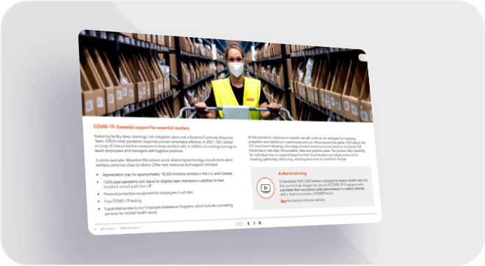 COVID-19: Essential support for essential workers Featuring facility deep cleanings, risk mitigation plans and a Business Continuity Response As the pandemic continues to subside, we will continue our strategies for boosting Team, GXO’s initial pandemic response proved remarkably effective. In 2021, GXO added protection and resilience in warehouses and our offices around the globe. GXO sites in the an array of new protective measures to keep workers safe, in addition to existing trainings to U.S. have been following a five-stage phased recovery process based on localized CDC teach employees and managers safe hygiene practices. transmission rate data, immunization rates and positive cases. The process offers flexibility for individual sites to respond based on their local situation and adjust protocols for A prime example: Wearable Microshare social distancing technology sounds alerts when masking, gatherings, distancing, cleaning and more as conditions change. workers come too close to others. Other new resources and support included: • Appreciation pay for approximately 18,500 frontline workers in the U.S. and Canada A shot at winning • 100% paid pandemic sick leave for eligible team members in addition to their In December 2021, GXO started a program to reward workers who did standard annual paid time off their part to help mitigate the spread of COVID-19. Employees who • Personal protective equipment for employees in all sites submitted their vaccination cards were entered in a weekly drawing • Free COVID-19 testing with a chance to receive a $10,000 bonus. • Expanded access to our Employee Assistance Programs, which include counseling See the reactions of some winners. services for mental health issues 44 | 2021 ESG Report ©2022 GXO Logisitcs, Inc. HOME E S G