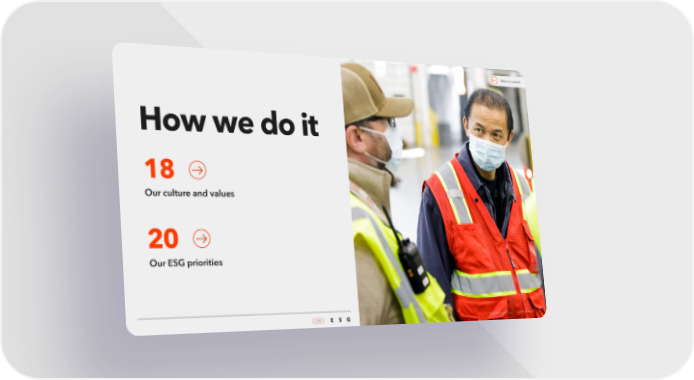 GXO Logistics ESG Report Page 16 Page 18Return to contents How we do it 18 Our culture and values 20 Our ESG priorities 2021 ESG Report | 17 ©2022 GXO Logisitcs, Inc. 2021 ESG Report | 17 HOME HOME E S G ©2022 GXO Logisitcs, Inc. E S G