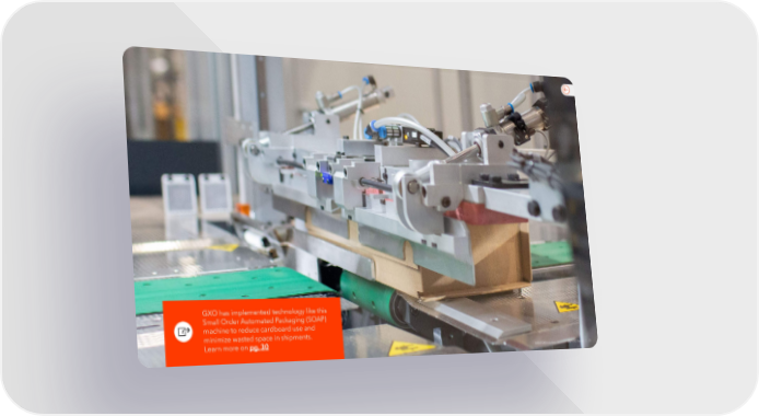 GXO has implemented technology like this Small Order Automated Packaging (SOAP) machine to reduce cardboard use and minimize wasted space in shipments. Learn more on pg. 30 2021 ESG Report | 27 ©2022 GXO Logisitcs, Inc. 2021 ESG Report | 27 HOME E S G ©2022 GXO Logisitcs, Inc.