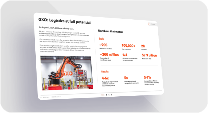 GXO: Logistics at full potential What we do On August 2, 2021, GXO was officially born. Numbers that matter We are a company of more than 100,000 people worldwide who see endless opportunities to drive innovation in logistics to help our customers unlock the full potential of their supply chains. Scale Our customers include more than a quarter of the Fortune 100 companies, and we are more than their suppliers; we are their strategic partners. ~900 100,000+ 28 From warehousing to distribution, we tailor supply chain management Warehouse locations Team members Countries solutions to the business challenges and complexities of different industries and use our knowledge and technology to deliver the results our customers demand. ~200 million 1/4 $7.9 billion Square feet of of Fortune 100 companies Revenue in 2021 warehouse space are our customers Results 4-6x 5x 5-7% Productivity improvement More items shipped Average labor efficiency with team members using robotic automation improvement by deploying supported by robots machine learning 10 | 2021 ESG Report ©2022 GXO Logisitcs, Inc. HOME E S G