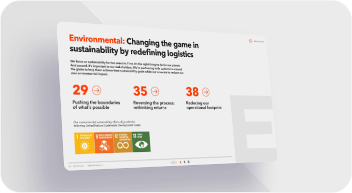 Return to contents Environmental: Changing the game in sustainability by redefining logistics We focus on sustainability for two reasons. First, it’s the right thing to do for our planet. And second, it’s important to our stakeholders. We’re partnering with customers around the globe to help them achieve their sustainability goals while we innovate to reduce our own environmental impact. 29 35 38 Pushing the boundaries Reversing the process: Reducing our of what’s possible rethinking returns operational footprint Our environmental sustainability efforts align with the following United Nations Sustainable Development Goals: 28 | 2021 ESG Report ©2022 GXO Logisitcs, Inc. 28 | 2021 ESG Report ©2022 GXO Logisitcs, Inc. HOME HOME E S G E S G