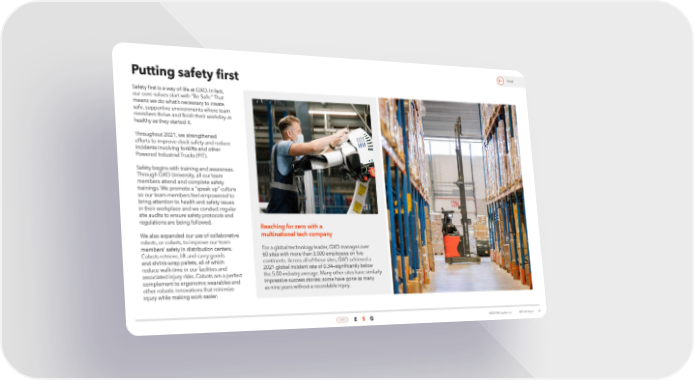 Return to contents Social Putting safety first Safety first is a way of life at GXO. In fact, our core values start with “Be Safe.” That means we do what’s necessary to create safe, supportive environments where team members thrive and finish their workday as healthy as they started it. Throughout 2021, we strengthened efforts to improve dock safety and reduce incidents involving forklifts and other Powered Industrial Trucks (PIT). Safety begins with training and awareness. Through GXO University, all our team members attend and complete safety trainings. We promote a “speak up” culture so our team members feel empowered to bring attention to health and safety issues in their workplace and we conduct regular site audits to ensure safety protocols and regulations are being followed. Reaching for zero with a We also expanded our use of collaborative multinational tech company robots, or cobots, to improve our team For a global technology leader, GXO manages over members’ safety in distribution centers. 60 sites with more than 3,000 employees on five Cobots retrieve, lift and carry goods continents. Across all of these sites, GXO achieved a and shrink-wrap pallets, all of which 2021 global incident rate of 0.34—significantly below reduce walk-time in our facilities and the 5.00 industry average. Many other sites have similarly associated injury risks. Cobots are a perfect impressive success stories; some have gone as many complement to ergonomic wearables and as nine years without a recordable injury. other robotic innovations that minimize injury while making work easier. HOME E S G ©2022 GXO Logisitcs, Inc. 2021 ESG Report | 43